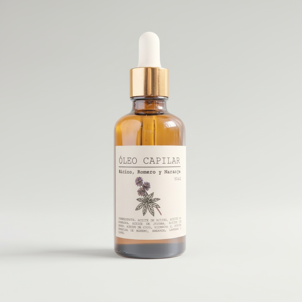 Aceite de ricino, aceite de almendras, aceite de jojoba, aceite de argan, aceite de coco fraccionado, aceite esencial de bergamota, aceite esencial de lavanda, aceite esencial de romero, aceite esencial de limon.